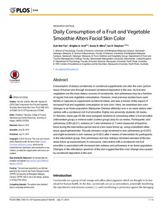 Kok Wei, T., Graf, B. A., Mitra, S. R. and Stephen, I. D. (2015) Daily consumption of a fruit and vegetable smoothie alters facial skin color. PLoS ONE, 10 (7). e0133445. ISSN 1932-6203 doi: 10.1371/journal.pone.0133445
