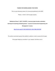 Ballesteros-Pérez, P. (2017) M-PERT: manual project-duration estimation technique for teaching scheduling basics. Journal of Construction Engineering and Management, 143 (9). 04017063. ISSN 0733-9364 doi: 10.1061/(ASCE)CO.1943-7862.0001358
