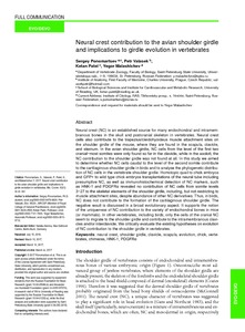 Neural crest (NC) is an established source for many endochondral and intramembranous bones in the skull and postcranial skeleton in vertebrates. Neural crest cells also contribute to the trapezius/cleidohyoideus muscle attachment sites on the shoulder girdle of the mouse, where they are found in the scapula, clavicle, and sternum. In the avian shoulder girdle, NC cells from the level of the first two cranial−most somites were only found so far in the clavicle, while in the axolotl, the NC contribution to the shoulder girdle was not found at all. In this study we aimed to determine whether NC cells caudal to the level of the second somite contribute to the cartilaginous shoulder girdle in birds and to analyse the phylogenetic distribution of NC cells in the vertebrate shoulder girdle. Homotopic quail to chick embryos and GFP+ to wild type chick embryos transplantations of the neural tube including presumptive NC, as well as immunohistochemical detection of NC markers, such as HNK-1 and PDGFRα revealed no contribution of NC cells from somite levels 3−27 to the skeletal elements of the shoulder girdle, including, but not restricting to muscle attachment sites, despite abundance of other NC derivatives. Thus, in birds, NC does not contribute to the formation of the cartilaginous shoulder girdle. The negative result is discussed in a broad evolutionary aspect. It supports the notion of the uniqueness of NC contribution to the variety of endochondral bones in mice (or mammals). In other vertebrates, including birds, only the cells of the cranial NC seem to migrate to the shoulder girdle and contribute to the intramembranous clavicles and/or interclavicle. We critically evaluate the existing hypotheses on evolution of NC contribution to the shoulder girdle in vertebrates.