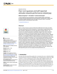 Due to a variety of reasons, people see themselves differently from how they see others. This basic asymmetry has broad consequences. It leads people to judge themselves and their own behavior differently from how they judge others and others’ behavior. This research, first, studies the perceptions and attitudes of Greek Public Sector employees towards the introduction of Performance-Related Pay (PRP) systems trying to reveal whether there is a divergence between individual attitudes and guesses on peers’ attitudes. Secondly, it is investigated whether divergence between own self-reported and peer norm guesses could mediate the acceptance of the aforementioned implementation once job status has been controlled for. This study uses a unique questionnaire of 520 observations which was designed to address the questions outlined in the preceding lines. Our econometric results indicate that workers have heterogeneous attitudes and hold heterogeneous beliefs on others’ expectations regarding a successful implementation of PRP. Specifically, individual perceptions are less skeptical towards PRP than are beliefs on others’ attitudes. Additionally, we found that managers are significantly more optimistic than lower rank employees regarding the expected success of PRP systems in their jobs. However, they both expect their peers to be more negative than they themselves are.
