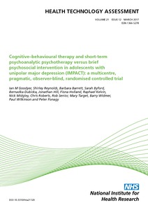 Goodyer, I. M., Reynolds, S., Barrett, B., Byford, S., Dubicka, B., Hill, J., Holland, F., Kelvin, R., Midgley, N., Roberts, C., Senior, R., Target, M., Widmer, B., Wilkinson, P. and Fonagy, P. (2017) Cognitive-behavioural therapy and short-term psychoanalytic psychotherapy versus brief psychosocial intervention in adolescents with unipolar major depression (IMPACT): a multicentre, pragmatic, observer-blind, randomised controlled trial. Health Technology Assessment, 21 (12). pp. 1-94. ISSN 1366-5278 doi: 10.3310/hta21120