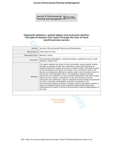 Skouloudis, A., Jones, N., Roumeliotis, S., Issac, D., Greig, A. and Evangelinos, K. (2017) Industrial pollution, spatial stigma and economic decline: the case of Asopos river basin through the lens of local small business owners. Journal of Environmental Planning and Management, 60 (9). pp. 1575-1600. ISSN 0964-0568 doi: 10.1080/09640568.2016.1243519