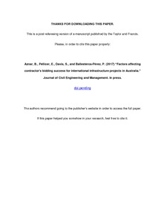 Aznar, B., Pellicer, E., Davis, S. and Ballesteros-Pérez, P. (2017) Factors affecting contractor's bidding success for international infrastructure projects in Australia. Journal of Civil Engineering and Management, 23 (7). pp. 880-889. ISSN 1822-3605 doi: 10.3846/13923730.2017.1341955