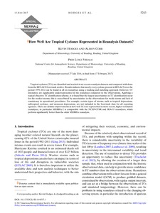 Tropical cyclones (TCs) are identified and tracked in six recent reanalysis data sets and compared with those from the IBTrACS best track archive. Results indicate that nearly every cyclone present in IBTrACS over the period 1979-2012 can be found in all six reanalyses using a tracking and matching approach. However, TC intensities are significantly under-represented in the reanalyses compared to the observations. Applying a typical objective TC identification scheme, it is found that the largest uncertainties in TC identification occur for the weaker storms; this is exacerbated by uncertainties in the observations for weak storms and lack of consistency in operational procedures. For example, it is unclear whether certain types of storms, such as tropical depressions, subtropical cyclones and monsoon depressions, are included in the best track data for all reporting agencies. There are definite improvements in how well TCs are represented in more recent, higher resolution reanalyses; in particular MERRA2 is comparable with the NCEP-CFSR and JRA55 reanalyses, which perform significantly better than the older MERRA reanalysis.