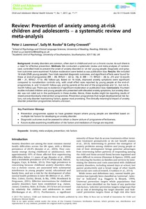 Lawrence, P. J., Rooke, S. M. and Creswell, C. (2017) Prevention of anxiety among at-risk children: a systematic review and meta-analysis. Child and Adolescent Mental Health, 22 (3). pp. 118-130. ISSN 1475-3588 doi: 10.1111/camh.12226
