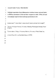 Follicular expression of pro-inflammatory cytokines tumour necrosis factor-α (TNFα), interleukin 6 (IL6) and their receptors in cattle: TNFα, IL6 and macrophages suppress thecal androgen production in vitro.
