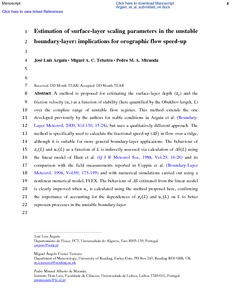 A method is proposed for estimating the surface-layer depth (zs) and the friction velocity (u∗) as a function of stability (here quantified by the Obukhov length, L) over the complete range of unstable flow regimes. This method extends that developed previously for stable conditions by Argaín et al. (Boundary-Layer Meteorol 130:15–28, 2009), but uses a qualitatively different approach. The method is specifically used to calculate the fractional speed-up (ΔS) in flow over a ridge, although it is suitable for more general boundary-layer applications. The behaviour of zs(L) and u∗(L) as a function of L is indirectly assessed via calculation of ΔS(L) using the linear model of Hunt et al. (Q J R Meteorol Soc 29:16–26, 1988) and its comparison with the field measurements reported in Coppin et al. (Boundary-Layer Meteorol 69:173–199, 1994) and with numerical simulations carried out using a non-linear numerical model, FLEX. The behaviour of ΔS estimated from the linear model is clearly improved when u∗ is calculated using the method proposed here, confirming the importance of accounting for the dependences of zs(L) and u∗(L) on L to better represent processes in the unstable boundary layer.