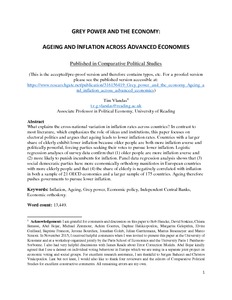 Vlandas, T. (2018) Grey power and the economy: ageing and inflation across advanced economies. Comparative Political Studies, 51 (4). pp. 514-552. ISSN 0010-4140 doi: 10.1177/0010414017710261