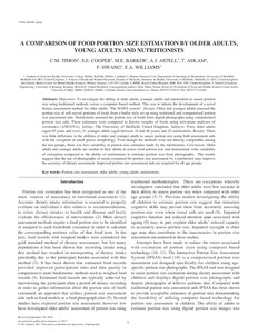 Objectives To investigate the ability of older adults, younger adults and nutritionists to assess portion size using traditional methods versus a computer-based method. This was to inform the development of a novel dietary assessment method for older adults “The NANA system”. Design Older and younger adults assessed the portion size of self-served portions of foods from a buffet style set up using traditional and computerised portion size assessment aids. Nutritionists assessed the portion size of foods from digital photographs using computerised portion size aids. These estimates were compared to known weights of foods using univariate analyses of covariance (ANCOVA). Setting The University of Sheffield, United Kingdom. Subjects Forty older adults (aged 65 years and over), 41 younger adults (aged between 18 and 40 years) and 25 nutritionists. Results There was little difference in the abilities of older and younger adults to assess portion size using both assessment aids with the exception of small pieces morphology. Even though the methods were not directly comparable among the test groups, there was less variability in portion size estimates made by the nutritionists. Conclusion Older adults and younger adults are similar in their ability to assess food portion size and demonstrate wide variability of estimation compared to the ability of nutritionists to estimate portion size from photographs. The results suggest that the use of photographs of meals consumed for portion size assessment by a nutritionist may improve the accuracy of dietary assessment. Improved portion size assessment aids are required for all age groups.