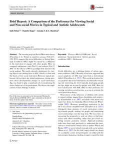 Dubey, I., Ropar, D. and Hamilton, A. (2017) Brief report: a comparison of the preference for viewing social and non-social movies in typical and autistic adolescents. Journal of Autism and Developmental Disorders, 47 (2). pp. 514-519. ISSN 0162-3257 doi: 10.1007/s10803-016-2974-3