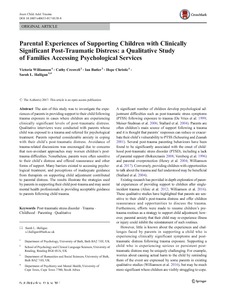 Williamson, V., Creswell, C., Butler, I., Christie, H. and Halligan, S. L. (2019) Parental experiences of supporting children with clinically significant post-traumatic distress: a qualitative study of families accessing psychological services. Journal of Child and Adolescent Trauma, 12 (1). pp. 61-72. ISSN 1936-1521 doi: 10.1007/s40653-017-0158-8