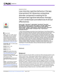 Lovell, K., Bower, P., Gellatly, J., Byford, S., Bee, P., McMillan, D., Arundel, C., Gilbody, S., Gega, L., Hardy, G., Reynolds, S., Barkham, M., Mottram, P., Lidbetter, N., Pedley, R., Molle, J., Peckham, E., Knopp-Hoffer, J., Price, O., Connell, J., Heslin, M., Foley, C., Plummer, F. and Roberts, C. (2017) Low-intensity cognitive-behaviour therapy interventions for obsessive-compulsive disorder compared to waiting list for therapist-led cognitive-behaviour therapy: 3-arm randomised controlled trial of clinical effectiveness. PLOS Medicine, 14 (6). e1002337. ISSN 1549-1676 doi: 10.1371/journal.pmed.1002337