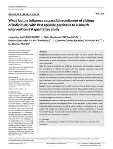 Sin, J., Henderson, C., Spain, D., Gamble, C. and Norman, I. (2017) What factors influence successful recruitment of siblings of individuals with first episode psychosis to e-health interventions? A qualitative study. Health Expectations, 20 (4). pp. 696-704. ISSN 1369-7625 doi: 10.1111/hex.12508