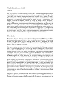 Purpose – This report examines the recent developments and trends relating to the Chinese government’s policy actions and the key issues that determine the choice of exchange rate regime in China. An up-to-date “stock-take” of the economic indicators is conducted to determine what is suitable for China in light of the rapidly evolving nature of the world economy and trading environment. This paper discusses the role of economic development, trade competitiveness, capital flow, foreign exchange reserve, and RMB internationalization in the determination of the RMB exchange rate regime. Design/methodology/approach – This research uses an inductive approach to gain a fine-grained understanding of the complex, multifaceted aspects of China’s exchange rate policy. A combination of statistical analysis, including basic descriptive statistics, trend analysis, and a correlation study are used to explore the association between various indicators and their implications. The report also draws on analysis of a broad range of data sources and the work of numerous researchers and research institutions. Findings – A more flexible exchange rate regime can play a complementary role towards rebalancing the Chinese economy by raising the buying capacity of families, rebalancing growth towards domestic consumption, and reducing reliance on export. China’s price elasticity of the demand for exports was relatively low that the appreciation of the Chinese currency has almost no influence on optimizing China’s trade balance. A more flexible two-way flow in RMB would be suitable under the current cash flow scenario in China. Reduced intervention will facilitate further adjustment in reserves. Lastly, in the early stage of RMB internationalization, flexibility in the exchange rate is one of the factors that influences its growth prospect as a reserve currency. Research limitations/implications – The findings and conclusion are derived based on the latest empirical information, statistical evidence, and economic theory. This inquiry does not build on a theory, and aims to neither verify a theory, nor test hypotheses. Rather, it aims to demonstrate, assess, and explain significant roles that various economic factors play in shaping the future exchange rate regime of China. Originality/value – This paper presents the rationale behind a more flexible two-way exchange rate, by assessing the latest empirical data and theoretical explanation that support such a move. Keywords Foreign exchange, Financial markets and the macroeconomy