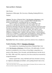Uncontrolled Keywords Mach, Hertz, mechanics, positivism, atomism, force, metaphysics