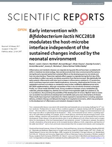 Lewis, M. C., Merrifield, C. A., Berger, B., Cloarec, O., Duncker, S., Mercenier, A., Nicholson, J. K., Holmes, E. and Bailey, M. (2017) Early intervention with Bifidobacterium lactis NCC2818 modulates the host-microbe interface independent of the sustained changes induced by the neonatal environment. Scientific reports, 7. 3510. ISSN 2045-2322 doi: 10.1038/s41598-017-05689-z