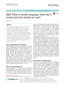 Pagel, M. ORCID: https://orcid.org/0000-0001-7287-8865 (2017) Q&A: What is human language, when did it evolve and why should we care? BMC Biology, 15 (1). 64. ISSN 1741-7007 doi: 10.1186/s12915-017-0405-3