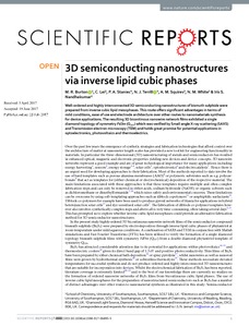 Burton, M. R., Lei, C., Staniec, P. A., Terrill, N. J., Squires, A. M., White, N. M. and Nandhakumar, I. S. (2017) 3D semiconducting nanostructures via inverse lipid cubic phases. Scientific Reports, 7 (1). 6405. ISSN 2045-2322 doi: 10.1038/s41598-017-06895-5