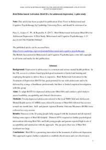 | Publisher Statement | This article has been accepted for publication (First View) in Behavioural and Cognitive Psychotherapy by Cambridge University Press, and should be referenced as: Pass, L., Lejuez, C. W., & Reynolds, S. (2017). Brief Behavioural Activation (Brief BA) for Adolescent Depression: A Pilot Study. Behavioural and Cognitive Psychotherapy, 1-13. doi:10.1017/S1352465817000443 The published article can be accessed here: https://www.cambridge.org/core/journals/behavioural-and-cognitive-psychotherapy The British Association for Behavioural and Cognitive Psychotherapies owns full copyright in all forms and media for this publication. |