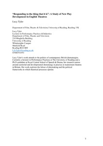 Tyler, L. (2019) “Responding to the thing that it is”: a study of new play development in English theatres. Studies in Theatre and Performance, 39 (1). pp. 38-53. ISSN 1468-2761 doi: 10.1080/14682761.2017.1348682