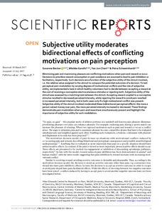 Becker, S., Gandhi, W. ORCID: https://orcid.org/0000-0003-3796-6311, Chen, Y. J. and Schweinhardt, P. (2017) Subjective utility moderates bidirectional effects of conflicting motivations on pain perception. Scientific Reports, 7 (1). 7790. ISSN 2045-2322 doi: 10.1038/s41598-017-08454-4