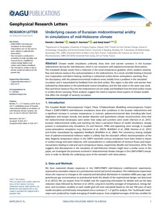 The CMIP5/PMIP3 mid-Holocene simulations show drier conditions in the Eurasian mid-continent and a significant increase in summer temperature; in contrast, paleoenvironmental data (including lake level, vegetation and isotope records, and aeolian deposits) and quantitative climate reconstructions show that the mid-continental extratropics were wetter than today and summers were cooler (Harrison et al., 2015). Eurasian mid-continental aridity and warming has been a persistent feature of model simulations, already present in atmosphere-only simulations (Yu & Harrison, 1996) and appearing more strongly in coupled ocean-atmosphere simulations (e.g. Braconnot et al., 2007b; Wohlfahrt et al., 2008; Harrison et al., 2015) and further exacerbated by vegetation feedback (Wohlfarht et al., 2004). The consistency among multiple lines of paleoenvironmental evidence makes it unlikely that the mismatch reflects misinterpretation of the data. Regional temperature biases in the CMIP5 20th century simulations have been linked to biases in surface energy and water balances, with over- or under-prediction of moisture fluxes and evapotranspiration leading to cold and warm temperature biases respectively (Mueller & Seneviratne, 2014). This suggests that discrepancies in the simulation of mid-Holocene climates might have a similar cause. In this paper, we investigate the processes involved in mid-continental climate changes in the CMIP5/PMIP3 simulations in order to identify the underlying cause of the mismatch with observations.