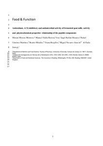 Moreno-Montoro, M., Olalla-Herrera, M., Rufián-Henares, J. Á., Martínez, R. G., Miralles, B., Bergillos, T., Navarro-Alarcón, M. and Jauregi, P. (2017) Antioxidant, ACE-inhibitory and antimicrobial activity of fermented goat milk: activity and physicochemical property relationship of the peptide components. Food & Function, 8 (8). pp. 2783-2791. ISSN 2042-650X doi: 10.1039/c7fo00666g