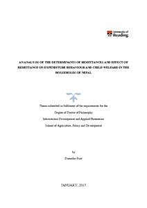 Pant, D. (2017) An analysis of the determinants of remittances and effect of remittance on expenditure behaviour and child welfare in the households of Nepal. PhD thesis, University of Reading.