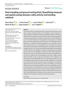 Conservation grazing for breeding birds needs to balance the positive effects on vegetation structure and negative effects of nest trampling. In the UK, populations of Common redshank Tringa totanus breeding on saltmarshes declined by >50% between 1985 and 2011. These declines have been linked to changes in grazing management. The highest breeding densities of redshank on saltmarshes are found in lightly grazed areas. Conservation initiatives have encouraged low-intensity grazing at <1 cattle/ha, but even these levels of grazing can result in high levels of nest trampling. If livestock distribution is not spatially or temporally homogenous but concentrated where and when redshank breed, rates of nest trampling may be much higher than expected based on livestock density alone. By GPS tracking cattle on saltmarshes and monitoring trampling of dummy nests, this study quantified (i) the spatial and temporal distribution of cattle in relation to the distribution of redshank nesting habitats and (ii) trampling rates of dummy nests. The distribution of livestock was highly variable depending on both time in the season and the saltmarsh under study, with cattle using between 3% and 42% of the saltmarsh extent and spending most their time on higher elevation habitat within 500 m of the sea wall, but moving further onto the saltmarsh as the season progressed. Breeding redshank also nest on these higher elevation zones, and this breeding coincides with the early period of grazing. Probability of nest trampling was correlated to livestock density and was up to six times higher in the areas where redshank breed. This overlap in both space and time of the habitat use of cattle and redshank means that the trampling probability of a nest can be much higher than would be expected based on standard measures of cattle density. Synthesis and applications: Because saltmarsh grazing is required to maintain a favorable vegetation structure for redshank breeding, grazing management should aim to keep livestock away from redshank nesting habitat between mid-April and mid-July when nests are active, through delaying the onset of grazing or introducing a rotational grazing system.