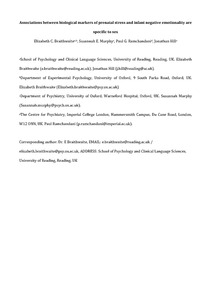 Braithwaite, E. C., Murphy, S. E., Ramchandani, P. G. and Hill, J. (2017) Associations between biological markers of prenatal stress and infant negative emotionality are specific to sex. Psychoneuroendocrinology, 86. pp. 1-7. ISSN 1873-3360 doi: 10.1016/j.psyneuen.2017.09.004