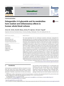 Pelargonidin-3-O-glucoside and its metabolites have modest anti-inflammatory effects in human whole blood cultures.