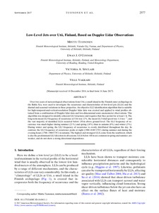 Over two years of meteorological observations from Utö, a small island in the Finnish outer archipelago in the Baltic Sea, were used to investigate the occurrence and characteristics of low-level jets (LLJs) and the diurnal and seasonal variations in these properties. An objective LLJ identification algorithm that is suitable for high-temporal-and-vertical-resolution Doppler lidar data was created and applied to wind profiles obtained from a combination of Doppler lidar data and two-dimensional sonic anemometer observations. This algorithm was designed to identify coherent LLJ structures and requires that they persist for at least 1 h. The long-term mean LLJ frequency of occurrence at Utö was 12%, the mean LLJ wind speed was 11.6 m s−1, and the vast majority of identified LLJs occurred below 150 m above ground level. The LLJ frequency of occurrence was much higher during summer (21%) and spring (18%) than in autumn (8%) and winter (3%). During winter and spring, the LLJ frequency of occurrence is evenly distributed throughout the day. In contrast, the LLJ frequency of occurrence peaks at night (1900–0100 UTC) during summer and during the evening hours (1700–1900 UTC) in autumn. The highest and strongest LLJs come from the southwest, which is also the predominant LLJ direction in all seasons. LLJs below 100 m are common in spring and summer, are weaker, and do not show a strong directional dependence.