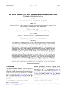 Tan, X., Bao, M., Hartmann, D. L. and Ceppi, P. (2017) The role of synoptic waves in the formation and maintenance of the Western Hemisphere circulation pattern. Journal of Climate, 30 (24). pp. 10259-10274. ISSN 1520-0442 doi: 10.1175/jcli-d-17-0158.1