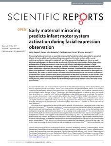 Rayson, H., Bonaiuto, J. J., Ferrari, P. F. and Murray, L. (2017) Early maternal mirroring predicts infant motor system activation during facial expression observation. Scientific Reports, 7 (1). 11738. ISSN 2045-2322 doi: 10.1038/s41598-017-12097-w