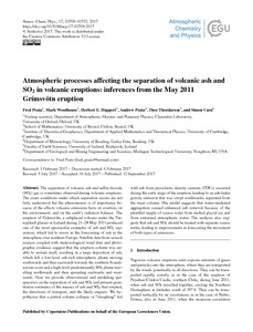 Prata, F., Woodhouse, M., Huppert, H. E., Prata, A., Thordarson, T. and Carn, S. (2017) Atmospheric processes affecting the separation of volcanic ash and SO2 in volcanic eruptions: inferences from the May 2011 Grímsvötn eruption. Atmospheric Chemistry and Physics, 17 (17). pp. 10709-10732. ISSN 1680-7316 doi: 10.5194/acp-17-10709-2017