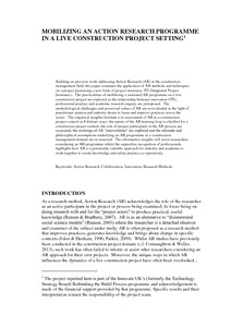 Building on previous work addressing Action Research (AR) in the construction management field, this paper examines the application of AR methods and techniques on a project pioneering a new form of project insurance: IPI (Integrated Project Insurance). The practicalities of mobilizing a sustained AR programme on a live construction project are explored as the relationship between innovation (IPI), professional practice and academic research enquiry are juxtaposed. The methodological challenges and perceived values of AR are re-evaluated in the light of practitioner opinion and industry desire to learn and improve practices across the sector. The empirical insights facilitate a re-assessment of AR in a construction project context in 4 distinct ways: the nature of the AR learning loop is clarified for a construction project context; the role of project participants in the AR process are examined; the workings of AR “interventions” are explored and the rationale and philosophical assumptions underlying an AR programme in a construction management domain are re-assessed. The informative insights will assist researchers considering an AR programme whilst the supportive recognition of professionals highlights how AR is a potentially valuable approach for industry and academia to work together to create knowledge and refine practice co-operatively.
