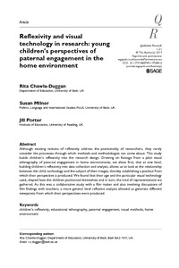 Chawla-Duggan, R., Milner, S. and Porter, J. (2018) Reflexivity and visual technology in research: young children’s perspectives of paternal engagement in the home environment. Qualitative Research, 18 (4). pp. 471-491. ISSN 1741-3109 doi: 10.1177/1468794117728412