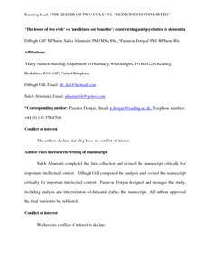 Gill, D., Almutairi, S. and Donyai, P. ORCID: https://orcid.org/0000-0001-5403-6170 (2019) ‘The lesser of two evils’ vs ‘medicines not Smarties’: constructing antipsychotics in dementia. The Gerontologist, 59 (3). pp. 570-579. ISSN 0016-9013 doi: 10.1093/geront/gnx178