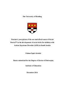 Alotaibi, F. E. (2017) Teachers’ perceptions of the use and effectiveness of Social Stories™ in the development of social skills for children with Autism Spectrum Disorder (ASD) in Saudi Arabia. PhD thesis, University of Reading.