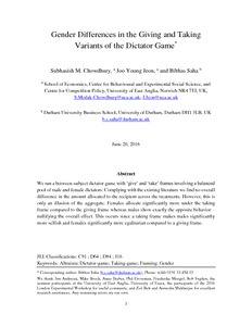 Chowdhury, S. M., Jeon, J. Y. ORCID: https://orcid.org/0000-0001-6855-1659 and Saha, B. (2017) Gender differences in the giving and taking variants of the dictator game. Southern Economic Journal, 84 (2). pp. 474-483. ISSN 2325-8012 doi: 10.1002/soej.12223