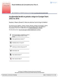 Powers, S. J., Mottram, D. S., Curtis, A. and Halford, N. G. (2017) Acrylamide levels in potato crisps in Europe from 2002 to 2016. Food Additives & Contaminants: Part A, 34 (12). pp. 2085-2100. ISSN 1944-0049 doi: 10.1080/19440049.2017.1379101