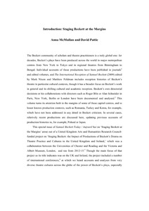 This Introduction contextualises the SBT/A 29.2 (2017) special issue on Staging Beckett at the Margins. The Beckett community of scholars and theatre practitioners is a truly global one: for decades, Beckett’s plays have been produced across the world in major metropolitan centres from New York to Tokyo and in regional theatres from Birmingham to Bengal. Individual accounts of those productions have been published in journals1 and edited volumes, and The International Reception of Samuel Beckett (2009) edited by Mark Nixon and Matthew Feldman includes reception histories of Beckett’s theatre in particular cultural contexts, though it has a broader focus on Beckett’s work in general and its shifting cultural and academic reception. Beckett’s own directorial decisions or his collaborations with directors such as Roger Blin or Alan Schneider in Paris, New York, Berlin or London have been documented and analysed.2 This volume turns its attention both to the margins of some of those capital centres, and to lesser known production contexts, such as Romania, Turkey and Korea, for example, which have not been addressed in any detail in Beckett criticism.