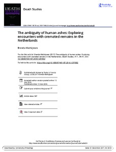 Mathijssen, B. (2017) The ambiguity of human ashes: exploring encounters with cremated remains in the Netherlands. Death Studies, 41 (1). pp. 34-41. ISSN 1091-7683 doi: 10.1080/07481187.2016.1257882