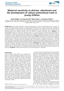 Wright, N., Hill, J., Sharp, H. and Pickles, A. (2018) Maternal sensitivity to distress, attachment and the development of callous-unemotional traits in young children. Journal of Child Psychology and Psychiatry, 59 (7). pp. 790-800. ISSN 0021-9630 doi: 10.1111/jcpp.12867