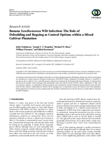 Nakakawa, J., Mugisha, J. Y. T., Shaw, M. W., Tinzaara, W. and Karamura, E. (2017) Banana Xanthomonas Wilt infection: the role of debudding and roguing as control options within a mixed cultivar plantation. International Journal of Mathematics and Mathematical Science, 2017. 4865015. ISSN 1687-0425 doi: 10.1155/2017/4865015