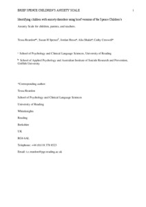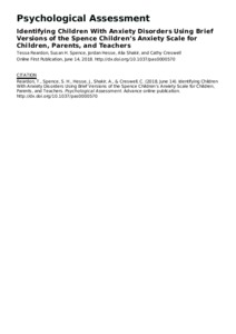 Reardon, T., Spence, S. H., Hesse, J., Shakir, A. and Creswell, C. (2018) Identifying children with anxiety disorders using brief versions of the Spence Children's Anxiety Scale for children, parents and teachers. Psychological Assessment: A Journal of Consulting and Clinical Psychology, 30 (10). pp. 1342-1355. ISSN 1040-3590 doi: 10.1037/pas0000570