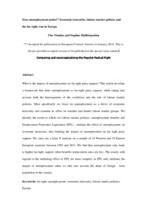 Vlandas, T. and Halikiopoulou, D. (2019) Does unemployment matter? Economic insecurity, labour market policies and the far-right vote in Europe. European Political Science, 18 (3). pp. 421-438. ISSN 1680-4333 doi: 10.1057/s41304-018-0161-z