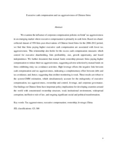 Uncontrolled Keywords Tax aggressiveness; executive compensation; ownership; leverage; China