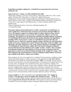 Most plant, animal and microbial species of widely varying body size and lifestyle are nearly equally fit as evidenced by their coexistence and persistence through millions of years. All organisms compete for a limited supply of organic chemical energy, derived mostly from photosynthesis, to invest in the two components of fitness: survival and production. All organisms are mortal because molecular and cellular damage accumulates over the lifetime; life persists only because parents produce offspring. We call this the equal fitness paradigm. The equal fitness paradigm occurs because: (1) there is a trade-off between generation time and productive power, which have equal-but-opposite scalings with body size and temperature; smaller and warmer organisms have shorter lifespans but produce biomass at higher rates than larger and colder organisms; (2) the energy content of biomass is essentially constant, ~22.4 kJ g−1 dry body weight; and (3) the fraction of biomass production incorporated into surviving offspring is also roughly constant, ~10–50%. As organisms transmit approximately the same quantity of energy per gram to offspring in the next generation, no species has an inherent lasting advantage in the struggle for existence. The equal fitness paradigm emphasizes the central importance of energy, biological scaling relations and power–time trade-offs in life history, ecology and evolution.