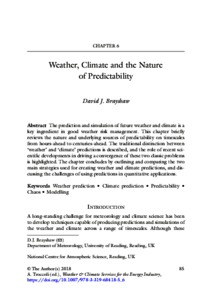 The prediction and simulation of future weather and climate is a key ingredient in good weather risk management. This chapter briefly reviews the nature and underlying sources of predictability on timescales from hours-ahead to centuries-ahead. The traditional distinction between ‘weather’ and ‘climate’ predictions is described, and the role of recent scientific developments in driving a convergence of these two classic problems is highlighted. The chapter concludes by outlining and comparing the two main strategies used for creating weather and climate predictions, and discussing the challenges of using predictions in quantitative applications.